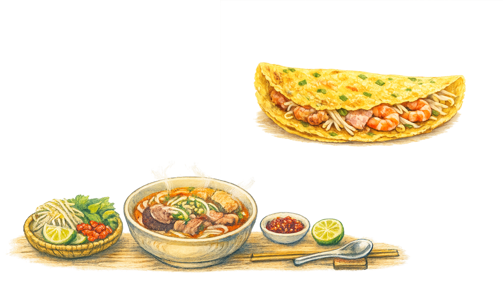 私の故郷のフエという地域では、『ブン・ボー・フエ』という名物料理があり、「ブン」と呼ばれる米麺に「ボー(牛)」から作ったスープと肉をのせて食べます。また、『バインセオ』という料理(塩味のパンケーキ)があり、「バイン」は小麦粉を使った料理全般を意味し、「セオ」はベトナム語で「鉄板で焼いた音」を表します。